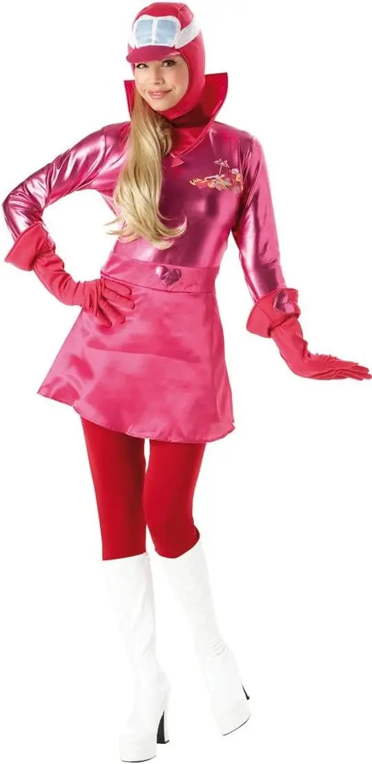 Penelope pit stop wacky races fancy dress adults costume. Pink colour. Includes dress with polo neck jumper detail, leggings, hat with embellished goggles and jersey with gloves.